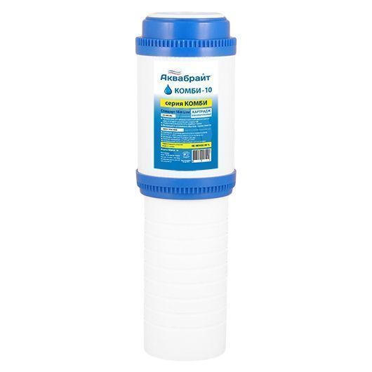 Картридж КОМБИ-10 содержит угольный наполнитель и спеченный полипропилен с пищевым допуском.
