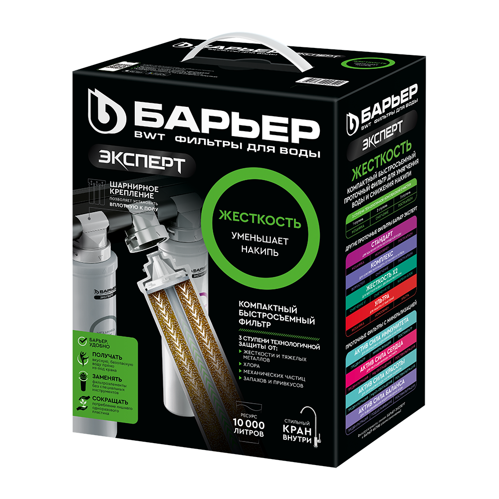 3."БАРЬЕР ЭКСПЕРТ ПостКарбон" - финишная очистка и кондиционирование, устранение неприятных привкусов и остаточного хлора. Ресурс - 10 000 литров.