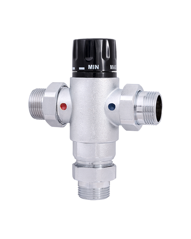 Трехходовой термостатический смесительный клапан с изменяемой в диапазоне от 30 до 50 °C настройкой. Предназначен для автоматического поддержания заданной температуры в системе горячего водоснабжения. Ее превышение исключается даже при полном отключении холодной воды, что позволяет использовать смеситель в школах, детских садах, других общественных зданиях. Термостат оперативно реагирует на изменение температуры и давления входящих потоков. Клапан выполнен из качественной латуни, никелирован. Встроенный термочувствительный элемент – жидкостного типа (наполнен толуолом). Патрубки клапана соединены накидными гайками с полусгонами. Резьба присоединений – внешняя. Входы смесителя комплектуются обратными клапанами из нейлона. Максимальная температура на входе горячей воды – 90 °C, допустимое рабочее давление входных потоков – до 10 бар.
